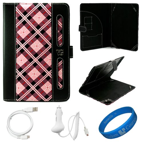 Black Friday Pink Plaid Executive Leather Folio Case Cover for Amazon Kindle Fire 7-inch Multi Touch Screen Tablet - 8GB Android Wireless (Wifi) Tablet + White Micro USB Car Charger + White Micro USB Sync Data Cable + SumacLife TM Wisdom Courage Wristband Overview